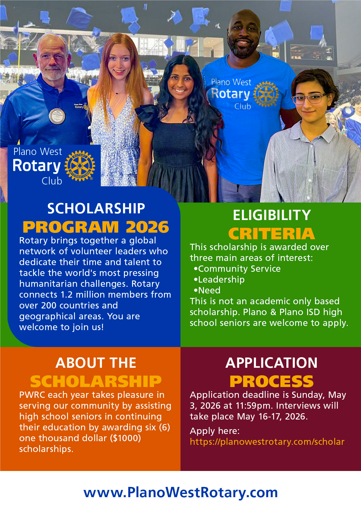One of the many activities that PWRC undertakes each year in serving our community is to assist Plano high school seniors in continuing their education by awarding six (6) one-thousand-dollar ($1,000.00) scholarships. This scholarship can be for technical or collegiate education.